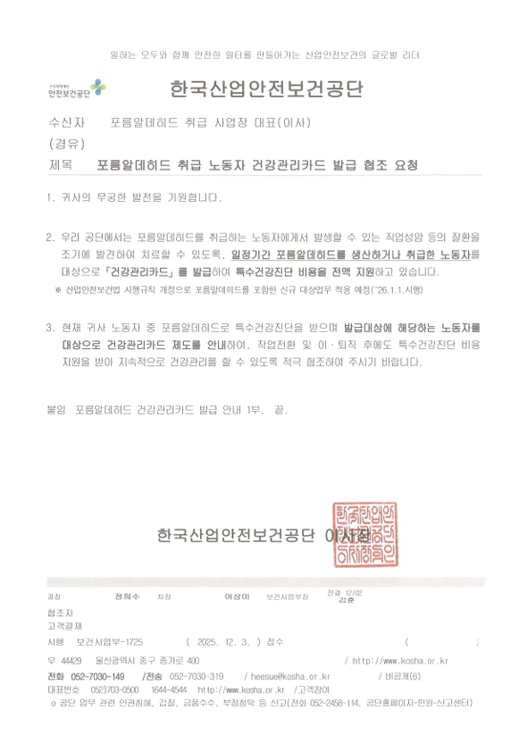2026.1.1부터 근로자 건강관리카드 발급 대상이 확대되었습니다.