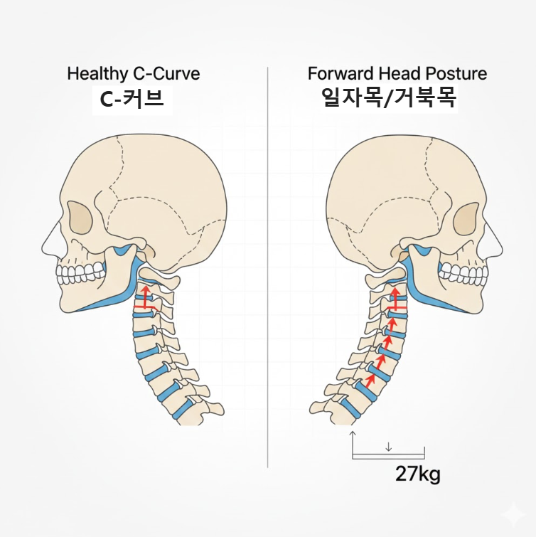 하지만 잘못된 자세가 지속되면 이 곡선이 무너지면서 '거북목'이나 '일자목'으로 변하게 됩니다.