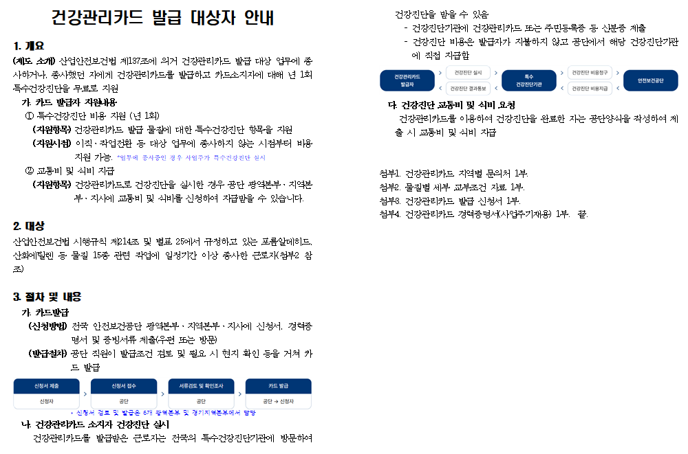 근로자 건강관리카드는 특정 유해인자(대상 물질) 취급업무에 종사했던 근로자를 대상으로, 업무를 그만둔 이후(이직·퇴직·업무전환 등)에도 건강을 추적 관리할 수 있도록 지원하는 제도예요.