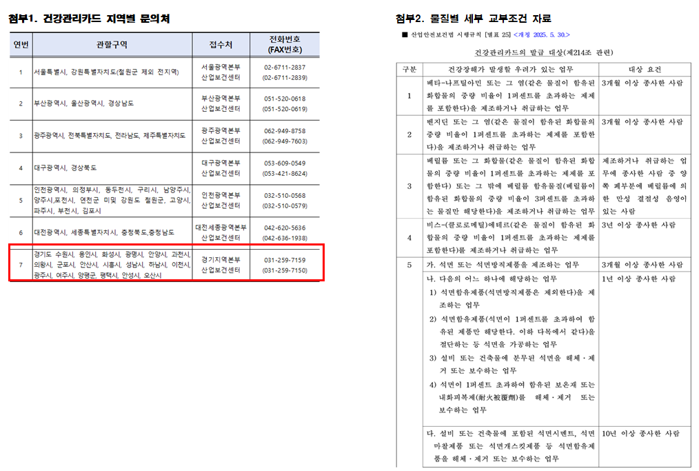근로자 건강관리카드는 아무나 발급되는 게 아니라, 법령에서 정한 ‘대상 물질(총 15종)’ 관련 업무에 일정 기간 이상 종사한 이력이 있는 근로자가 해당됩니다.