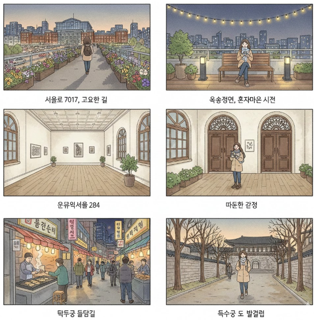 바쁜 하루가 끝나갈 무렵, 가방 하나 둘러메고 서울역에 내리면 도시의 다른 얼굴이 보입니다. 화려한 간판 대신 고요한 길, 높은 건물 사이로 불어오는 바람, 혼자라도 편안한 속도로 걷기 좋은 길이 이어집니다. 기차 시간 사이 잠깐이라도, 당일치기라도, 마음이 쉬어 갈 자리가 가까이에 숨어 있습니다.